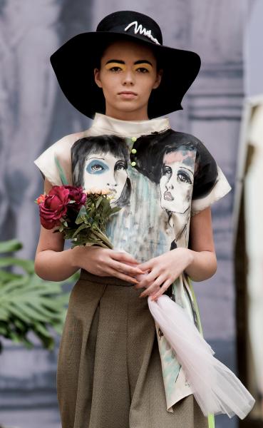 Acest top este personalizat printr-o pictura expresiva in culori pastelate subliniate prin pete puternice de negru.
